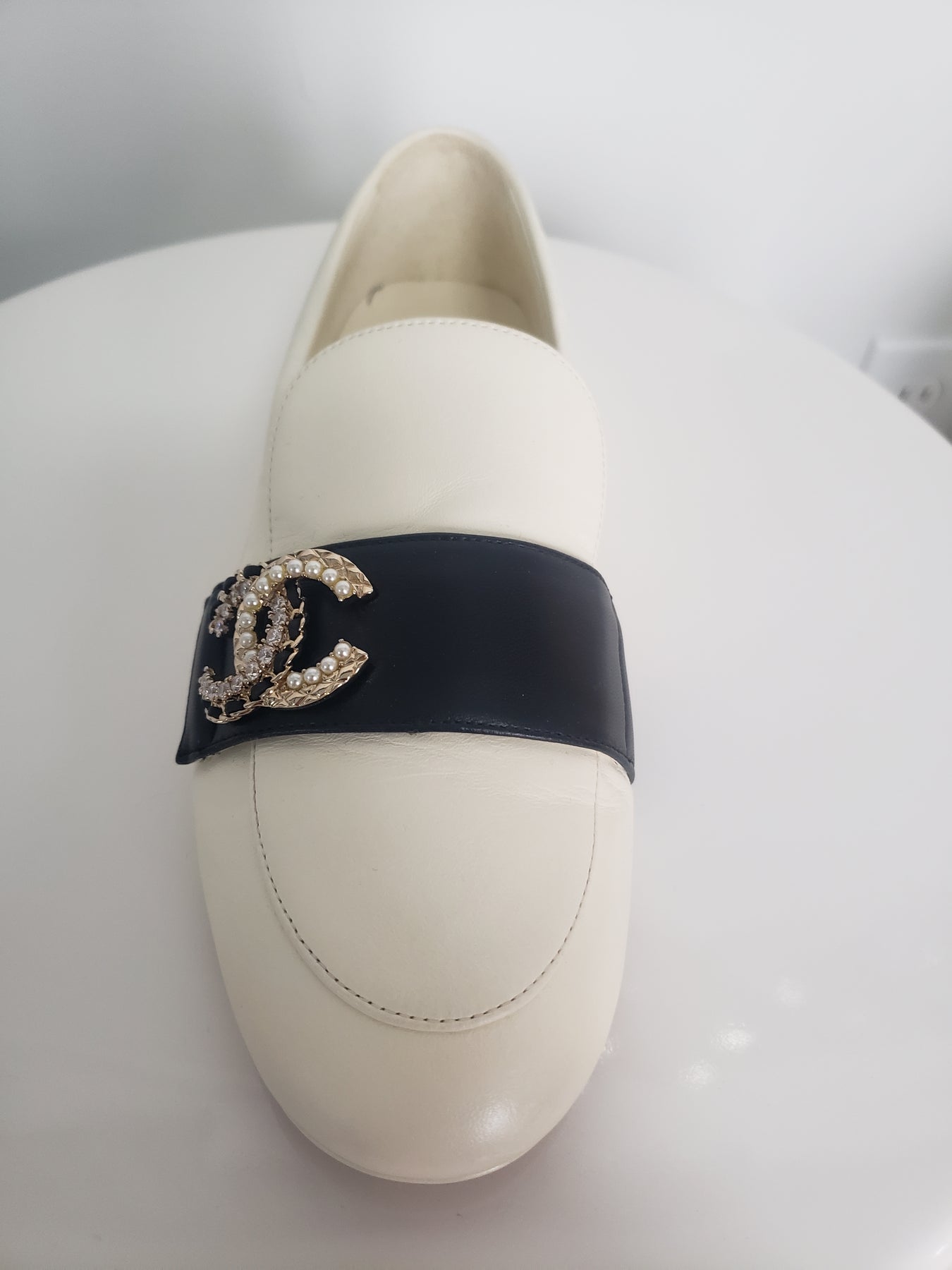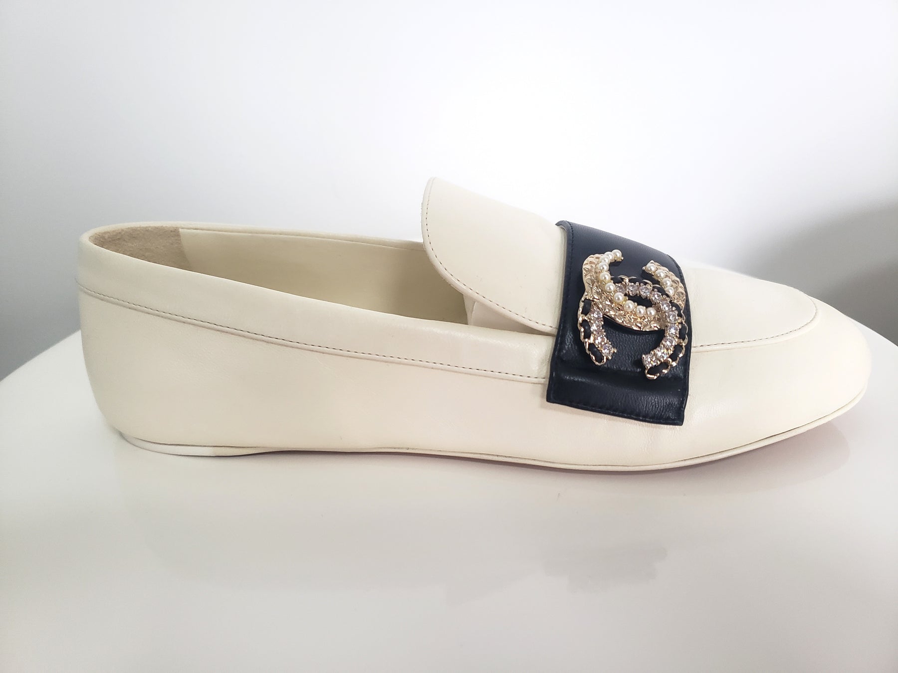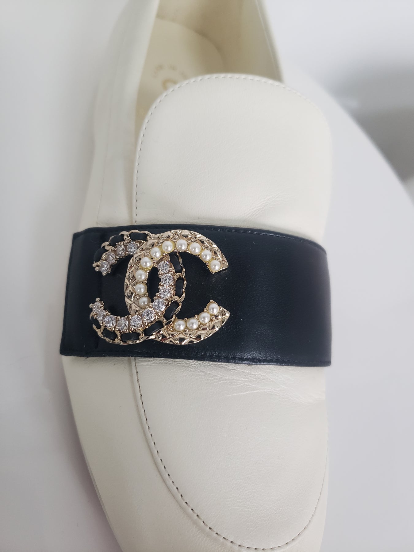 Chanel White CC Embellished Leather Loafers. Shoes are made of soft leather. CC logo embellished with pearls and crystals.