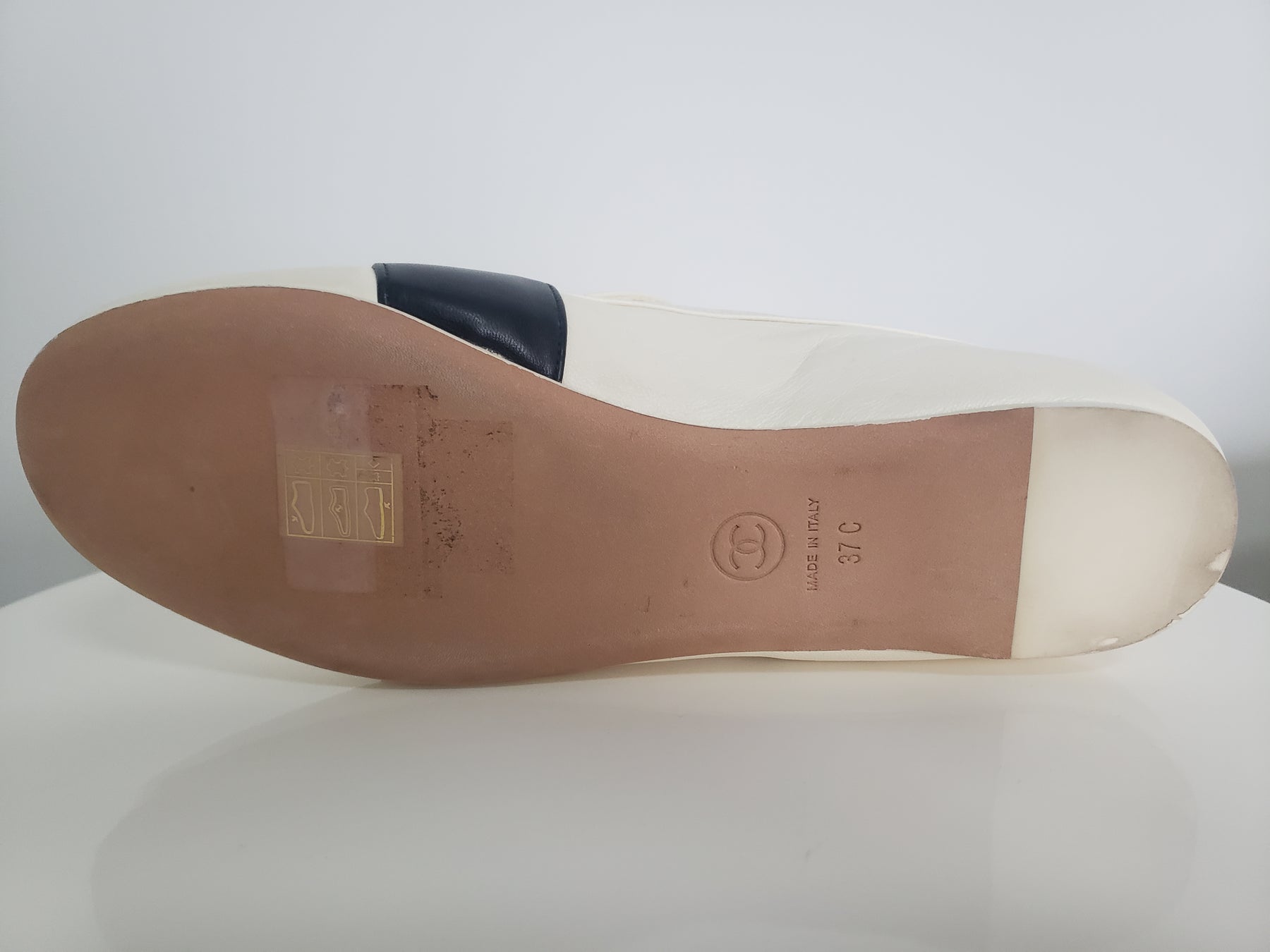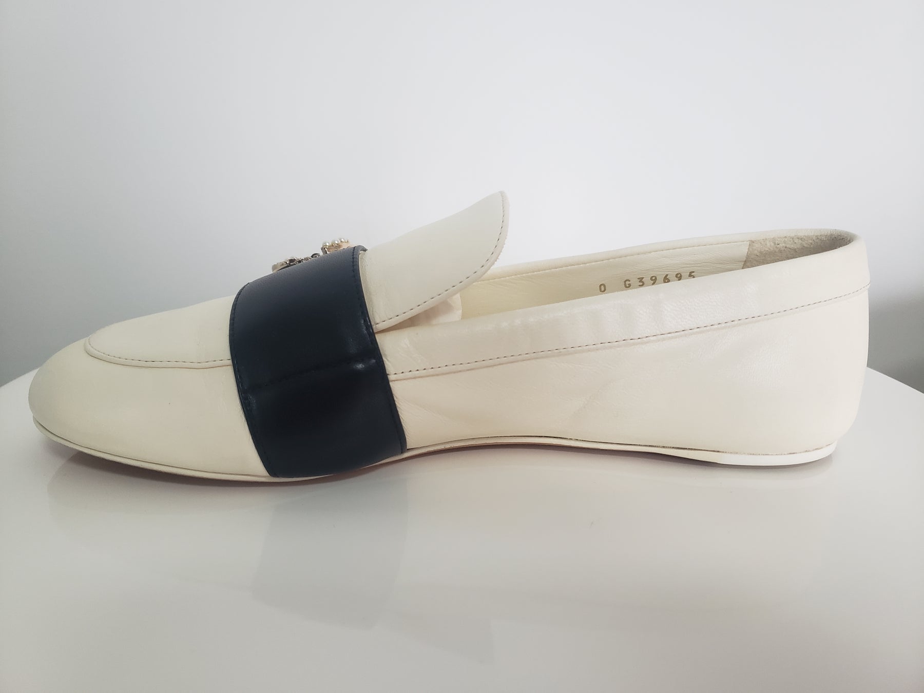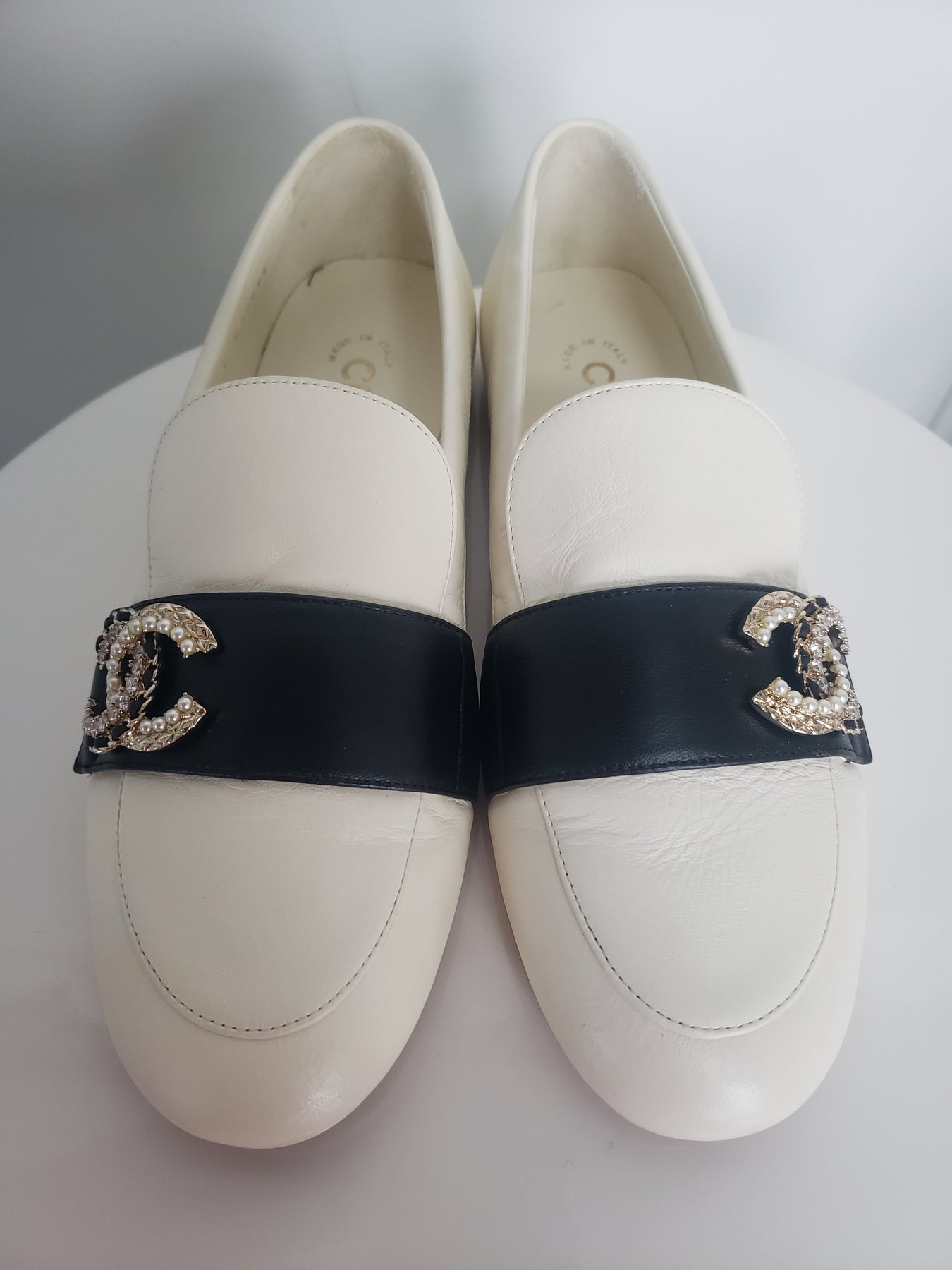 Chanel White CC Embellished Leather Loafers. Shoes are made of soft leather. CC logo embellished with pearls and crystals.