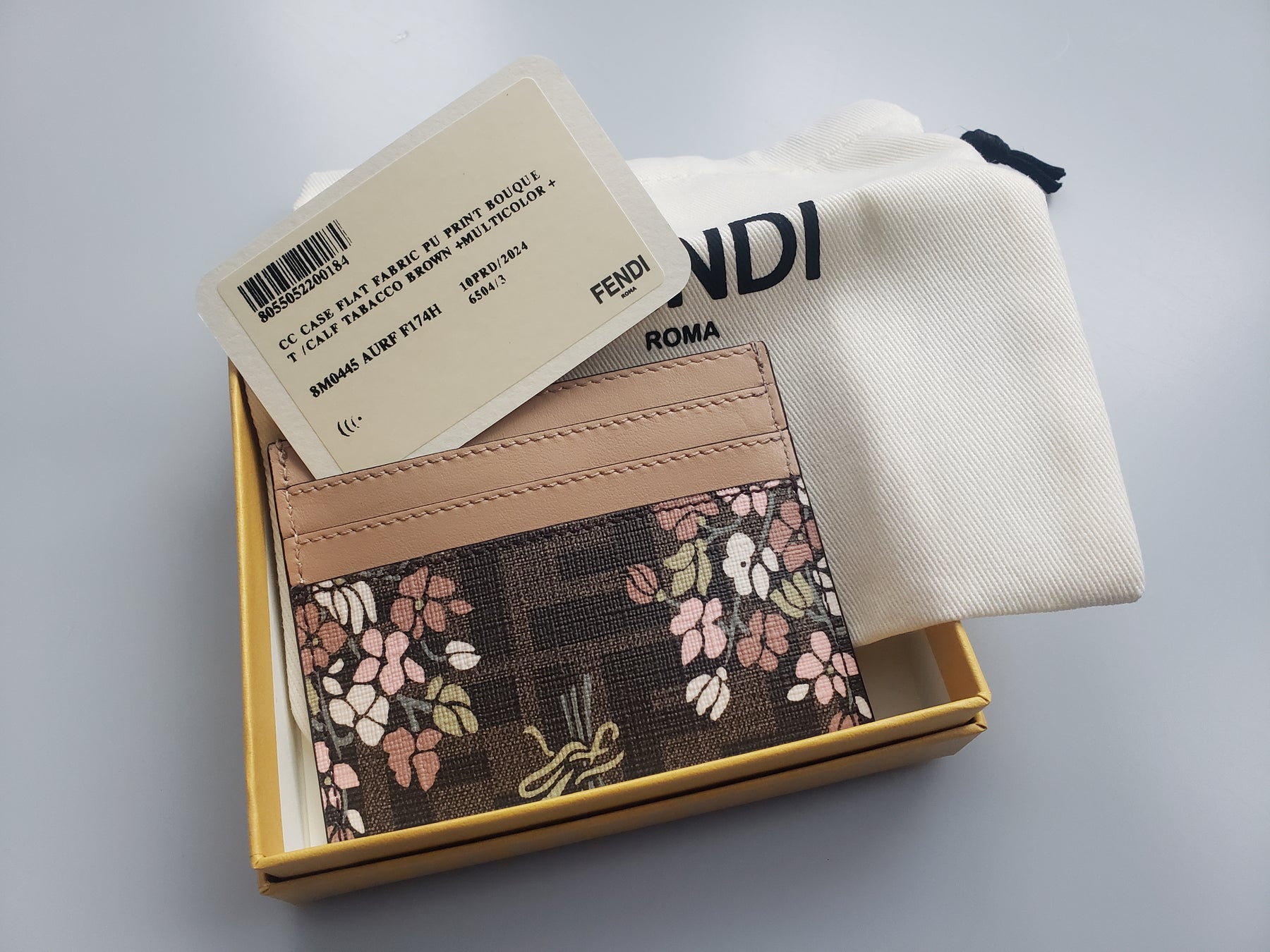 Fendi Flower Bouquet Brown FF Card Case. Made of jacquard coated canvas with iconic FF motif in brown and Fendi Flower Bouquet print. Central compartment and six card slots made of calfskin. Made in Italy