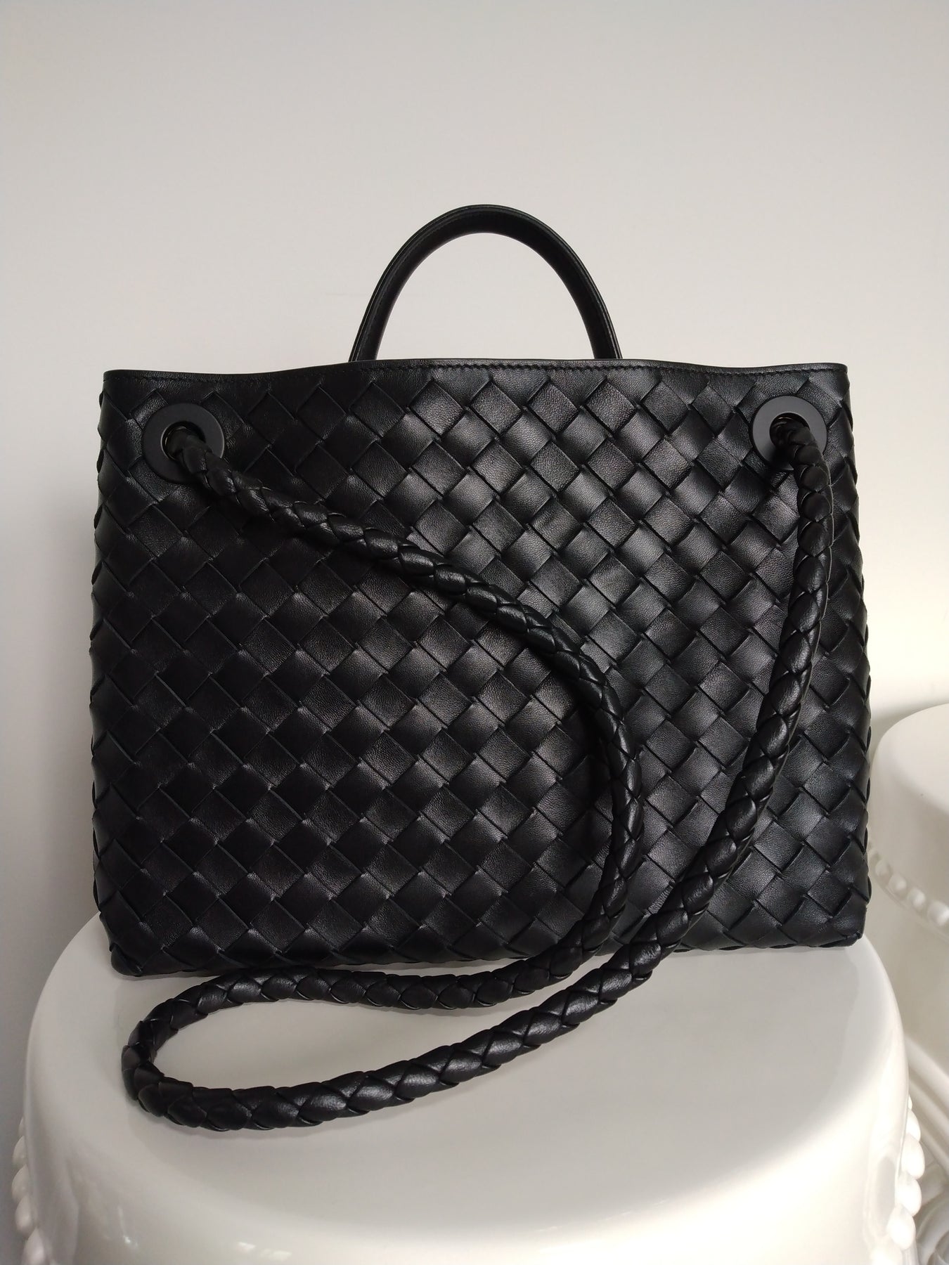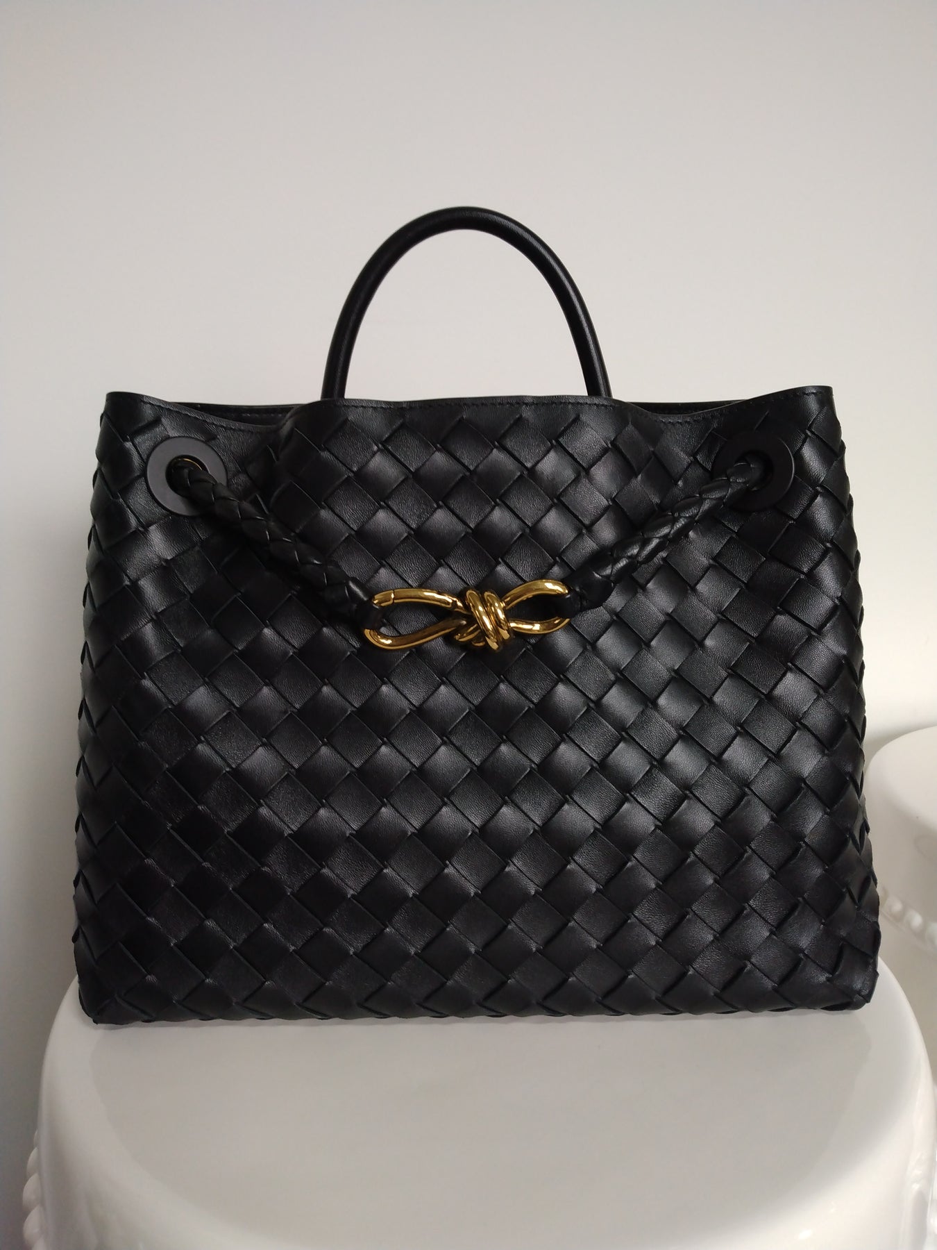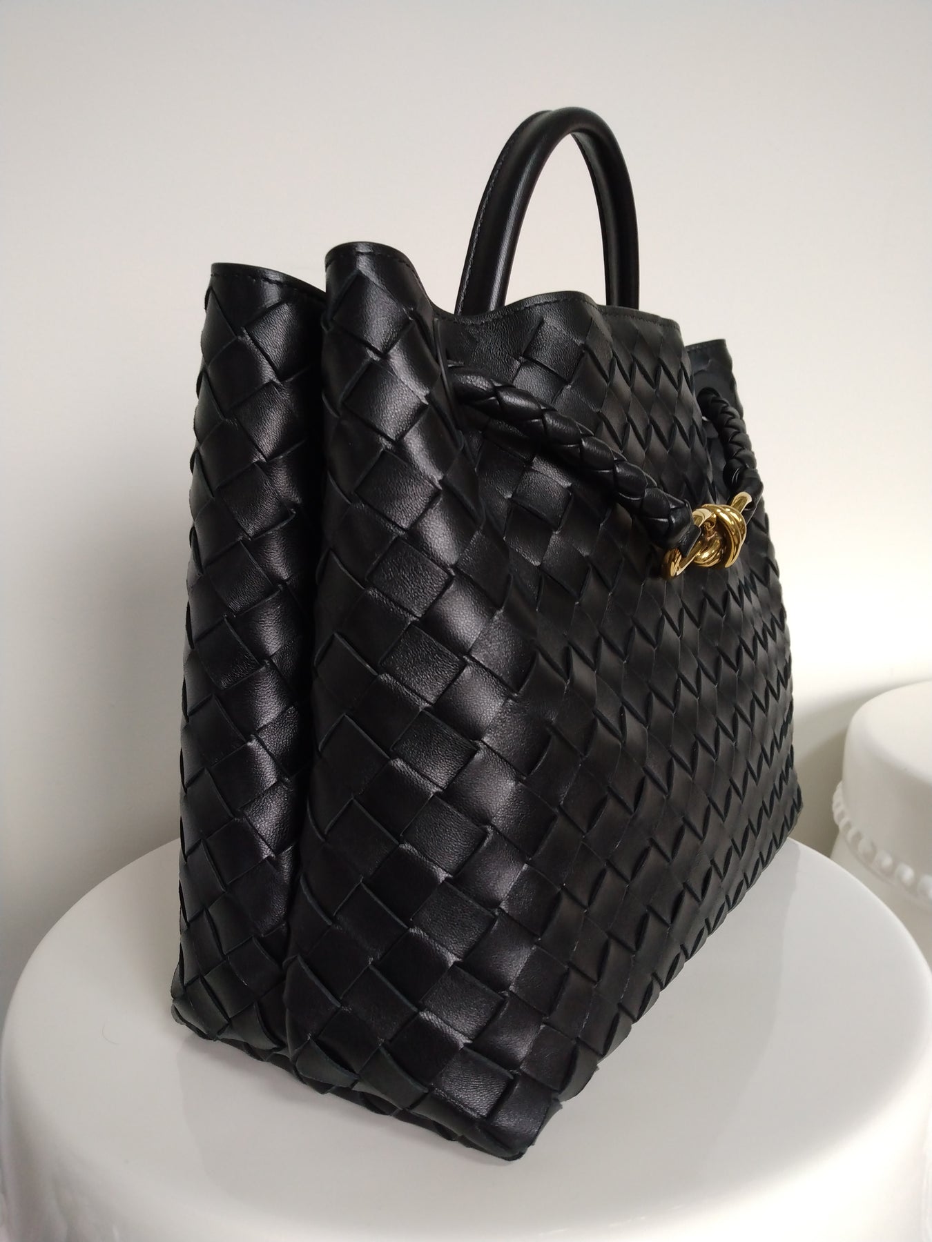 Bottega Veneta Black Medium Andiamo Bag. Top handle bag in supple Intrecciato leather with signature knot detail and sliding cross-body strap.