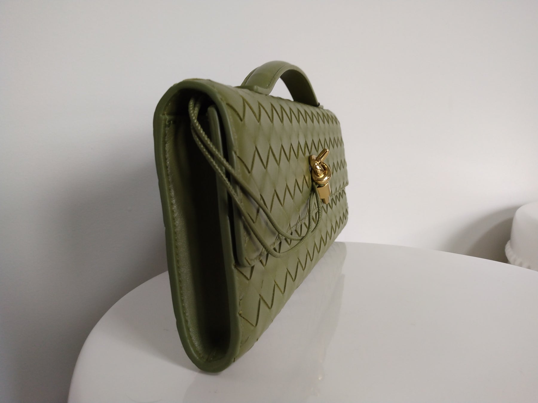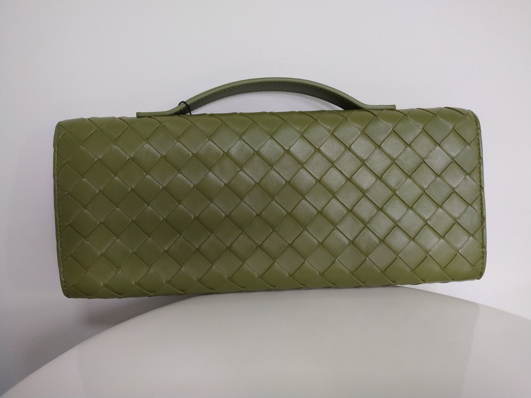 Bottega Veneta Green Andiamo Clutch.  Top handle clutch in supple Intrecciato leather with signature knot closure.