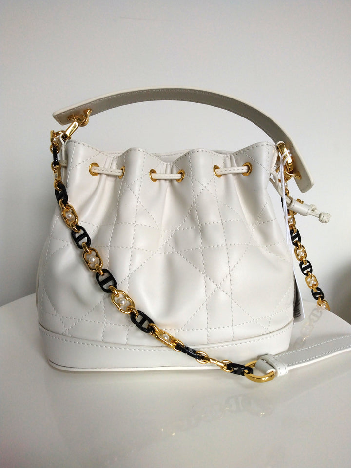 Christian Dior Latte Jolie Bucket Bag. Dior bucket bag is a modern creation. Embellished with Macrocannage topstitching. The chain strap with CD signature and pearls allows the small bag to be carried by hand, worn over the shoulder or crossbody. Dimensions: 6" H x 7" W x 4" D.