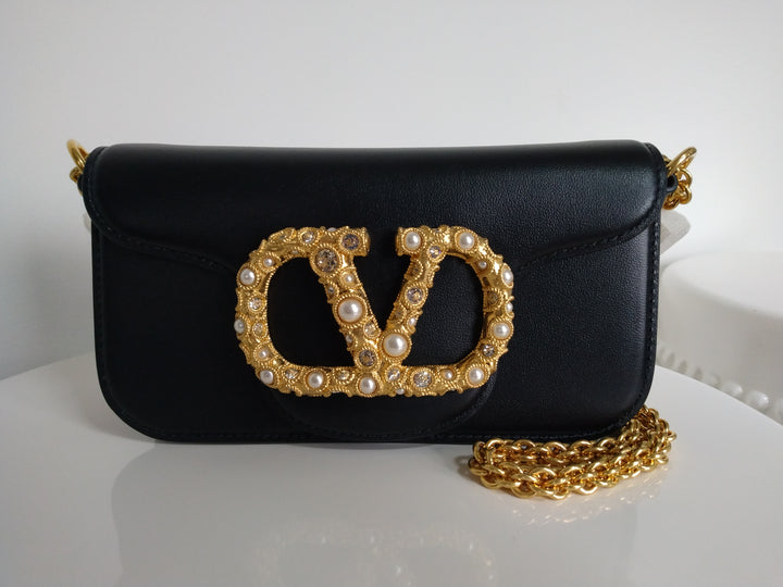Valentino Black Small Locò Shoulder Bag With Pearl Jewel Logo. Valentino Garavani Locò small calfskin shoulder bag with VLogo Signature jewel element. Equipped with both a detachable sliding chain and a detachable handle, this accessory can be worn as a crossbody/shoulder bag or carried as a handbag.