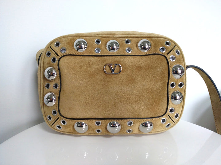 Valentino Havana Beige Nellcôte Suede Shoulder Bag. Valentino Garavani Nellcôte shoulder bag in suede leather and trim decorated with ball studs and rivets. The bag can be worn on the shoulder/cross-body thanks to the adjustable leather shoulder strap.