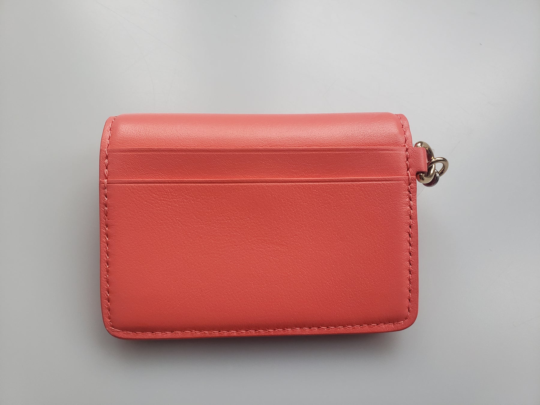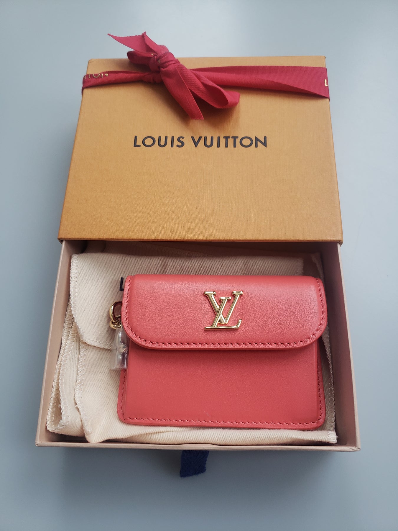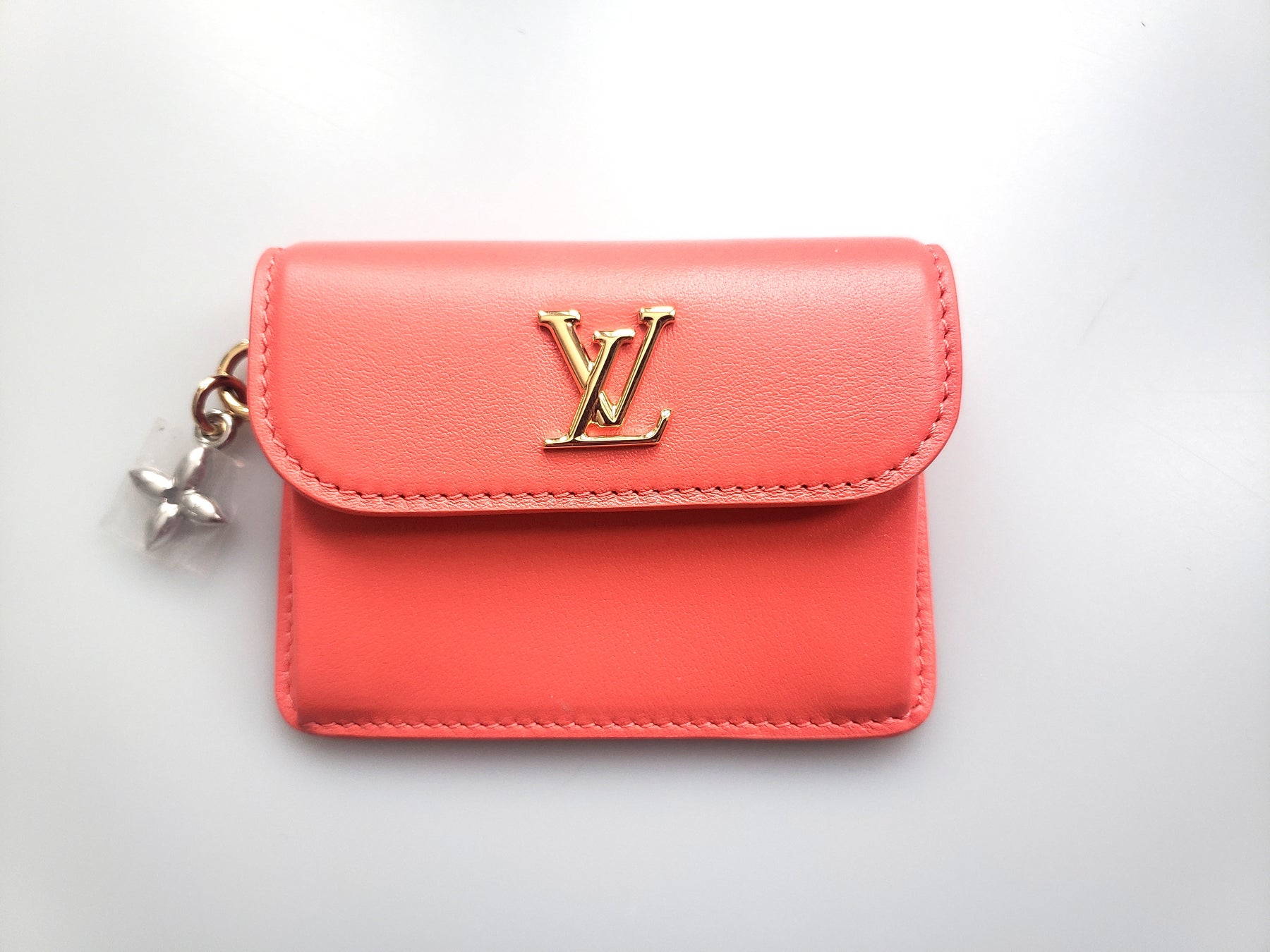 Louis Vuitton Coral Tiny Recto Verso Card Holder LV Bloom. Meet the Tiny Recto Verso Card Holder from the LV Bloom collection. Offered in a vibrant color palette, this elegant accessory is crafted from calfskin and adorned with a new signature Monogram Flower charm in a bi-galvanized metallic finish. It is designed with a pleated construction to maximize space, and includes a large front pocket, plus two card slots at the back.