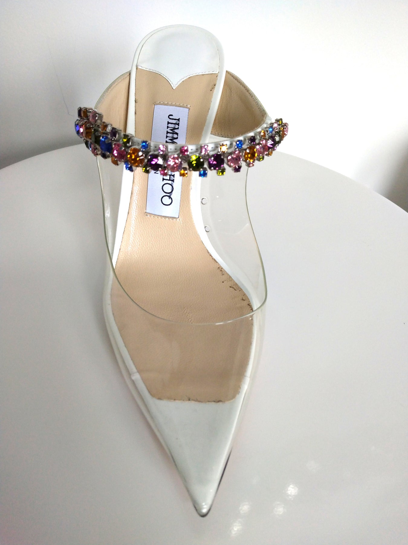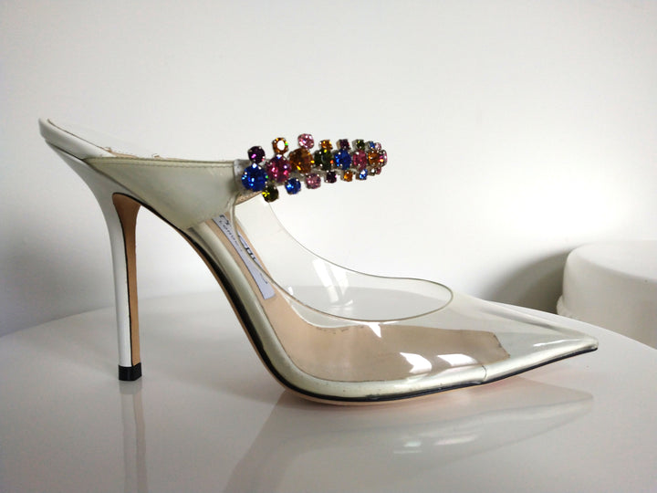 Jimmy Choo White/Clear Patent Leather Bing Heels. Featuring a crystal strap across the top of the foot.